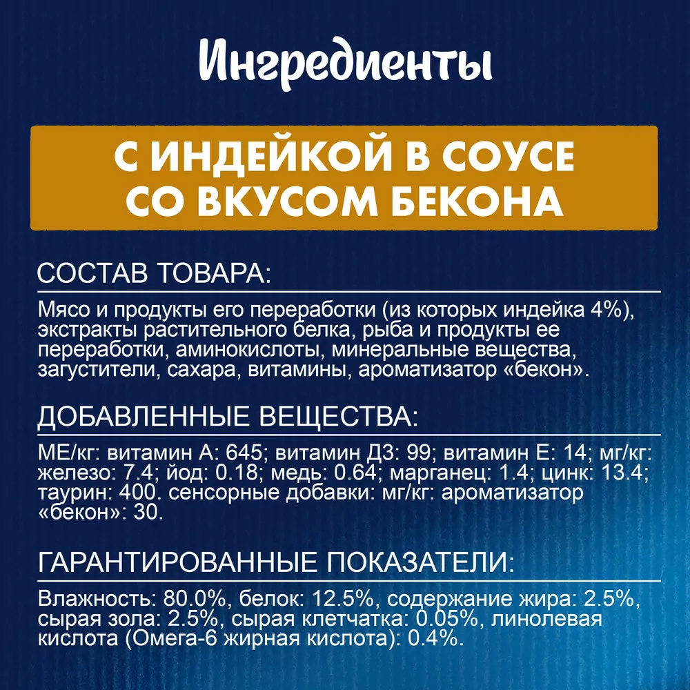 мясо и мясные ингредиенты (включая индейку), экстракты растительного белка, рыба и продукты ее переработки, аминокислоты, минеральные вещества, загустители, сахара, витамины, ароматизатор «бекон»