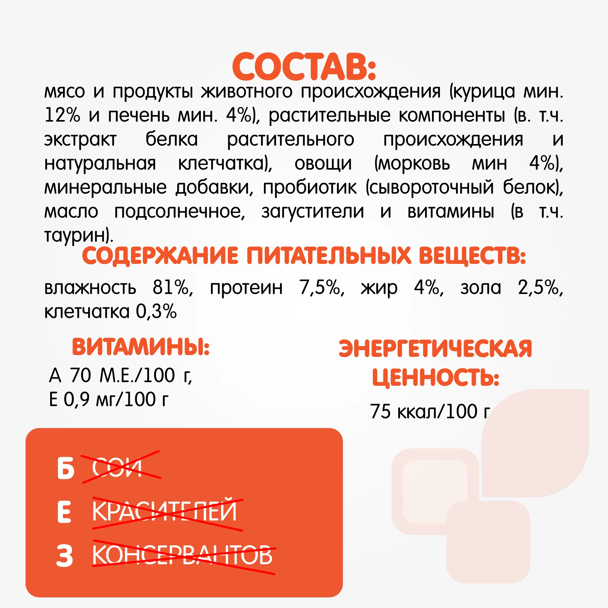Мясо и продукты животного происхождения (курица мин. 12% и печень мин. 4%), растительные компоненты (в т.ч. экстракт белка растительного происхождения и натуральная клетчатка), овощи (морковь мин. 4%), пробиотик (сывороточный белок), минеральные добавки, масло подсолнечное, загустители и витамины (в т.ч. таурин).