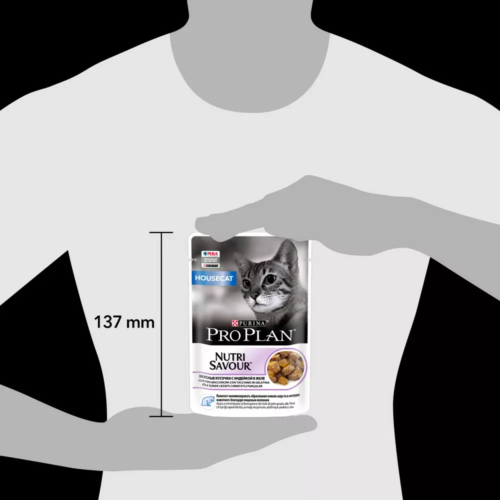 Для взрослой кошки среднего веса (4 кг) требуется 4 пакетика в день, разделенных минимум на два кормления. Индивидуальные потребности кошки могут варьироваться, и ежедневное количество корма должно быть скорректировано в соответствии с необходимостью поддержания оптимального веса кошки. Подавайте корм комнатной температуры. Следите, чтобы у вашей кошки всегда была чистая свежая питьевая вода