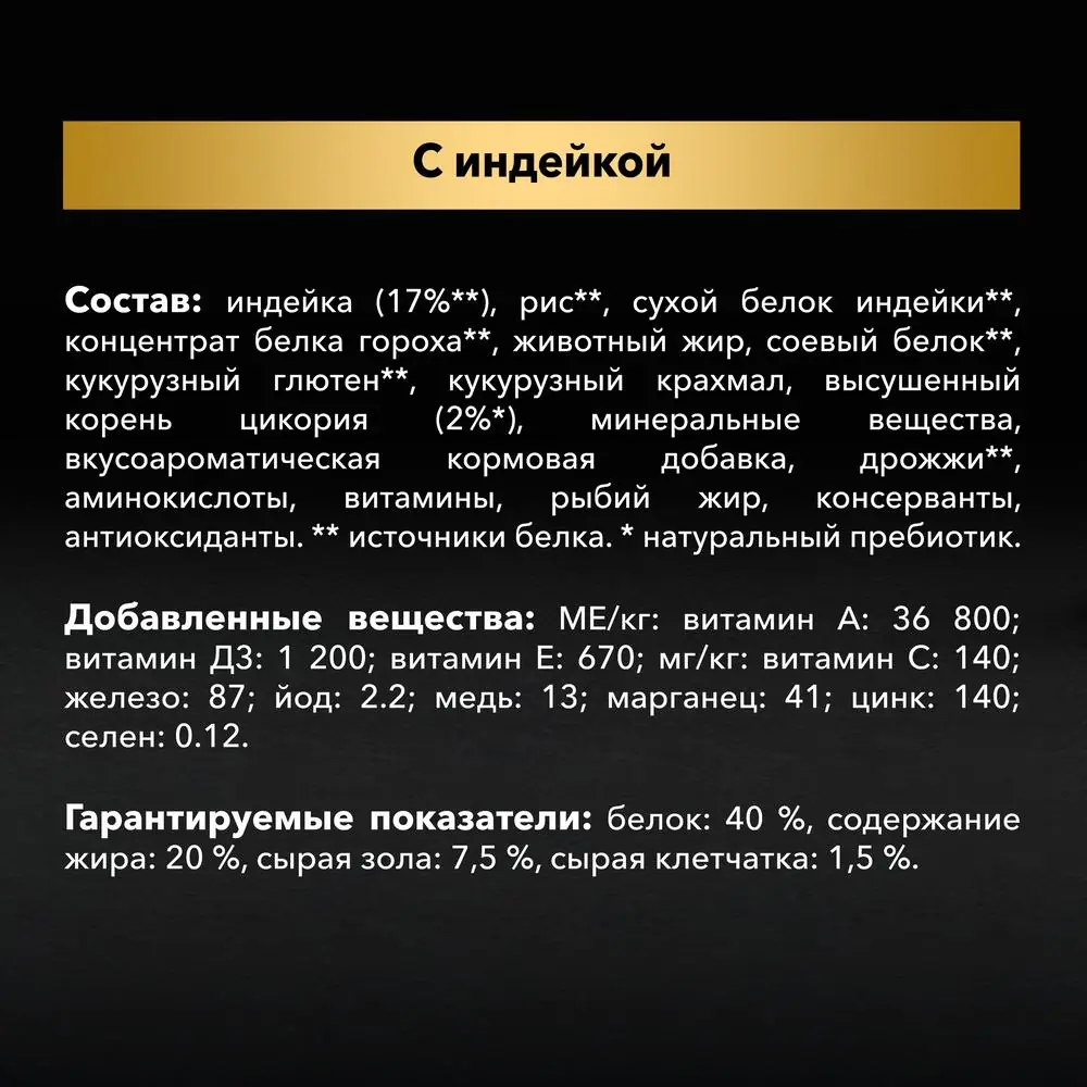 индейка (17%**), рис**, сухой белок индейки**, концентрат белка гороха**, животный жир, соевый белок**, кукурузный глютен**, кукурузный крахмал, высушенный корень цикория (2%*), минеральные вещества, вкусоароматическая кормовая добавка, дрожжи**, аминокислоты, витамины, рыбий жир, консерванты, антиоксиданты
