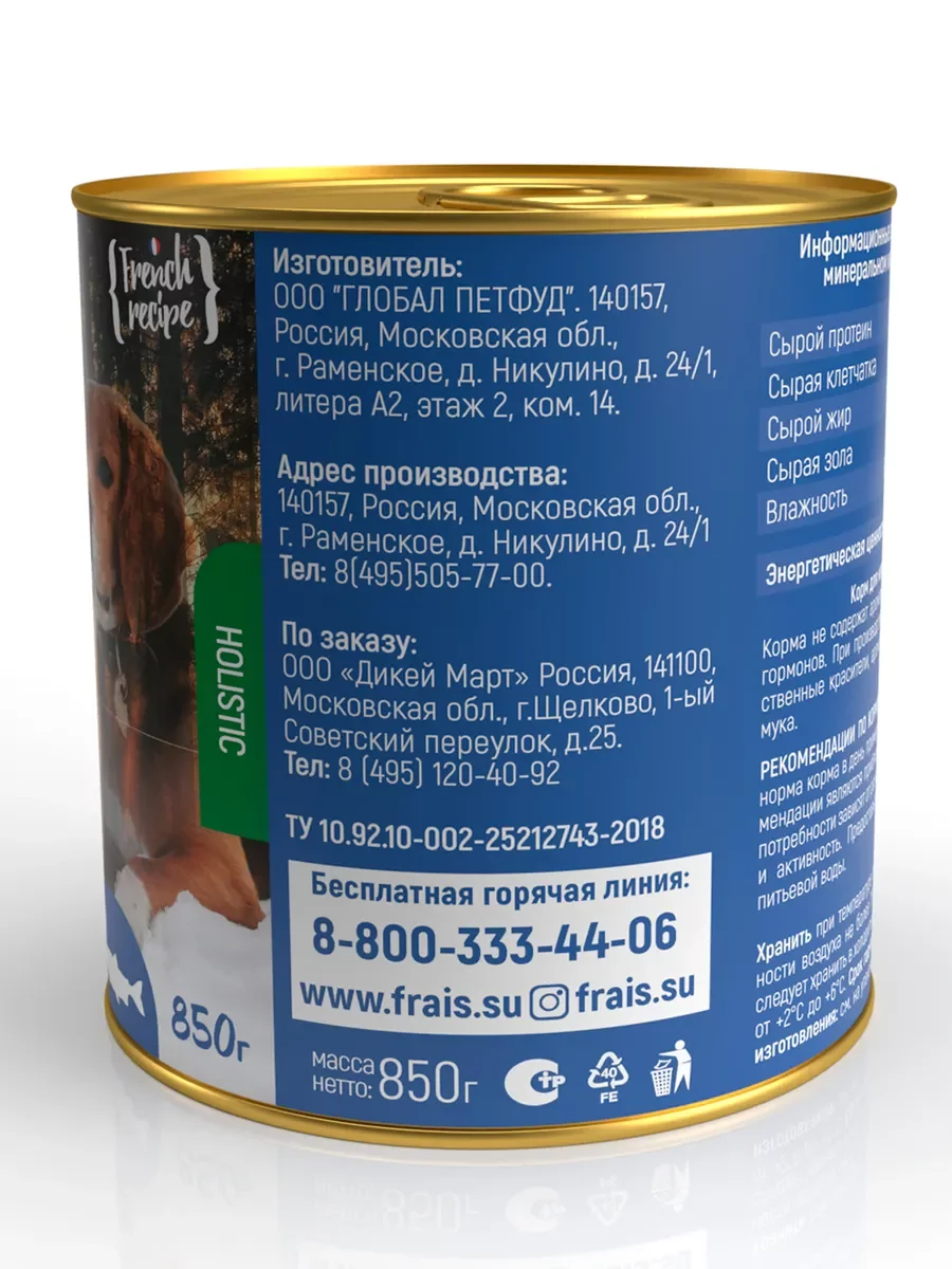 FRAIS HOLISTIC DOG КОНСЕРВЫ ДЛЯ СОБАК МЯСНЫЕ КУСОЧКИ С ЛОСОСЕМ В ЖЕЛЕ, 850 ГР