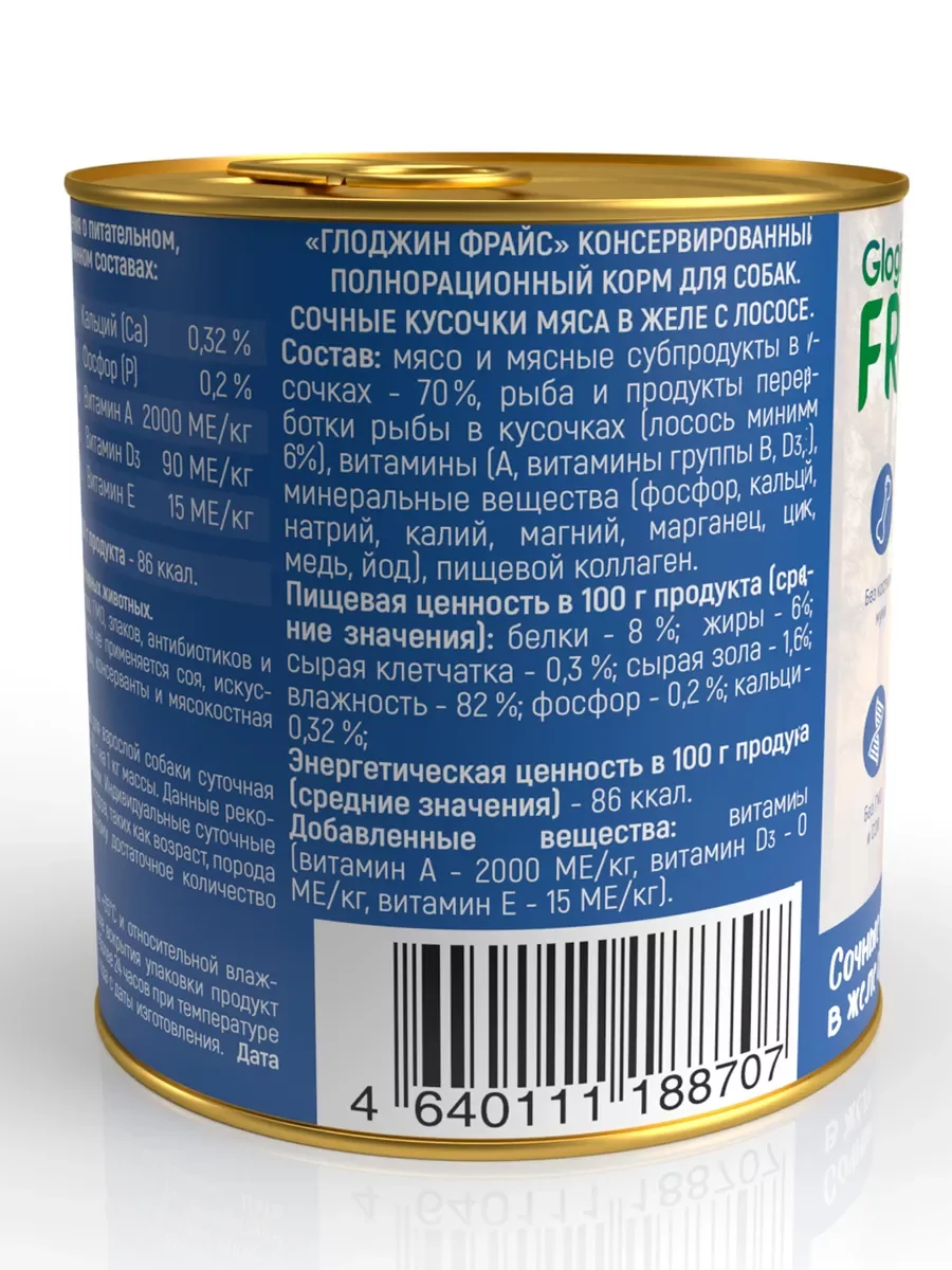 Glogin Frais консервированный полнорационный корм для собак. Сочные кусочки мяса в желе с лососем.