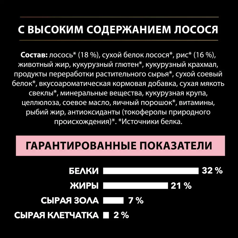 лосось* (18%), сухой белок лосося*, рис* (16%), животный жир, кукурузный глютен*, кукурузный крахмал, продукты переработки растительного сырья*, сухой соевый белок*, вкусоароматическая кормовая добавка, сухая мякоть свеклы*, минеральные вещества, кукурузная крупа, целлюлоза, соевое масло, яичный порошок*, витамины,рыбий жир, антиоксиданты (токоферолы природного происхождения)*.