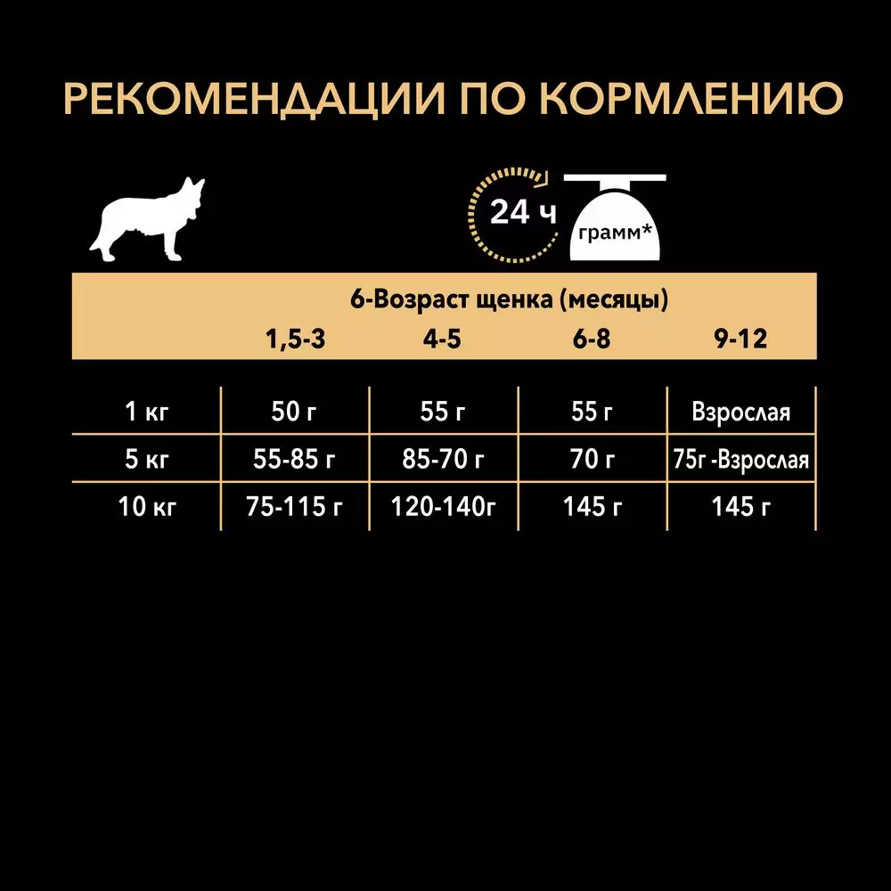 С 3 по 6 неделю начинайте давать размоченный корм Pro Plan® 3–4 раза в день. После полного прекращения кормления материнским молоком кормите согласно таблице. По достижении трехмесячного возраста постепенно снижайте количество воды, добавляемой для размачивания корма. Поддержание оптимальной массы тела очень важно для здоровья вашего щенка. Рекомендуемая суточная норма может варьироваться в зависимости от уровня активности, физических особенностей и индивидуальных потребностей вашего щенка. Следите, чтобы у собаки всегда была чистая, свежая питьевая вода. Для контроля здоровья вашей собаки обращайтесь в ветеринарную клинику на регулярной основе.