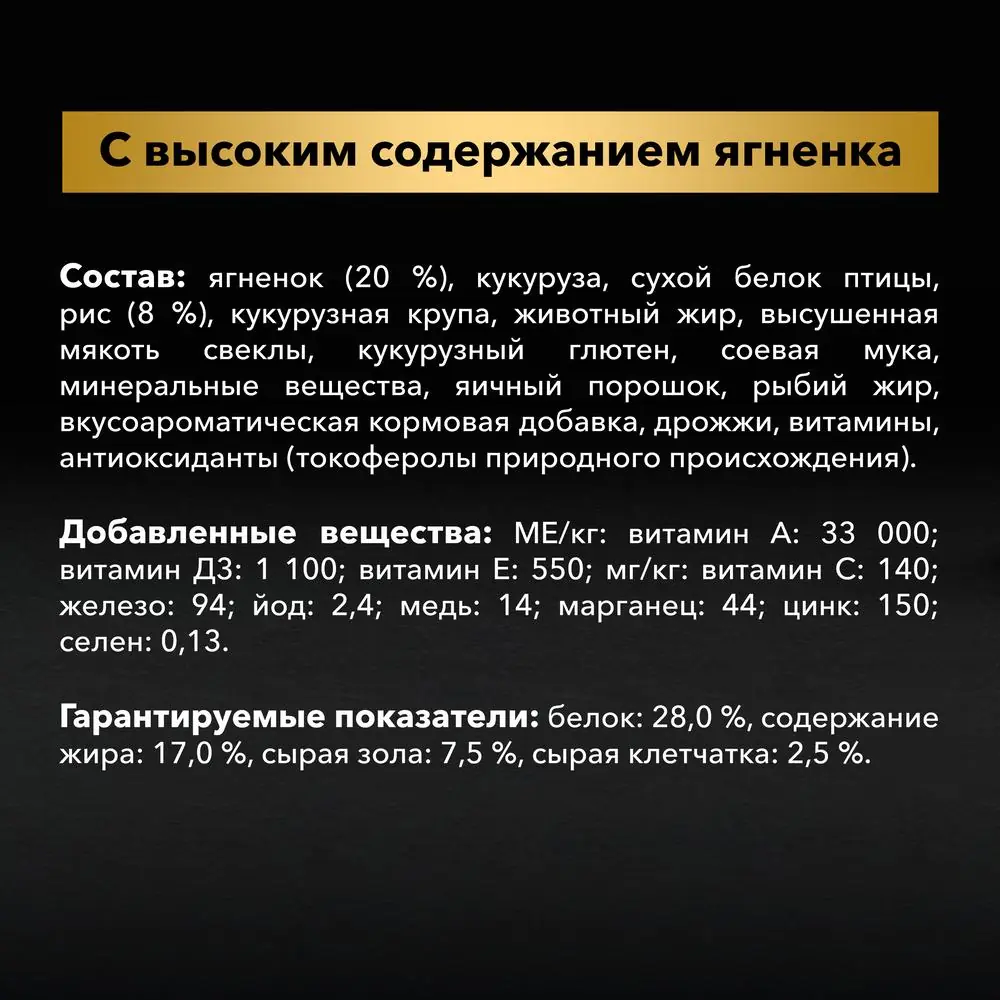 ягненок (20%), кукуруза, сухой белок птицы, рис (8%), кукурузная крупа, животный жир, высушенная мякоть свеклы, кукурузный глютен, соевая мука, минеральные вещества, яичный порошок, рыбий жир, вкусоароматическая кормовая добавка, дрожжи, витамины, антиоксиданты (токоферолы природного происхождения