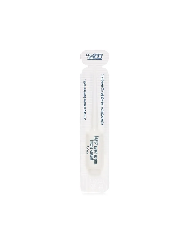 БАРС® капли против блох и клещей для собак в качестве действующих веществ содержат фипронил – 50 мг/мл, дифлубензурон – 1 мг/мл и дикарбоксимид (МГК-264) – 5 мг/мл и вспомогательные вещества