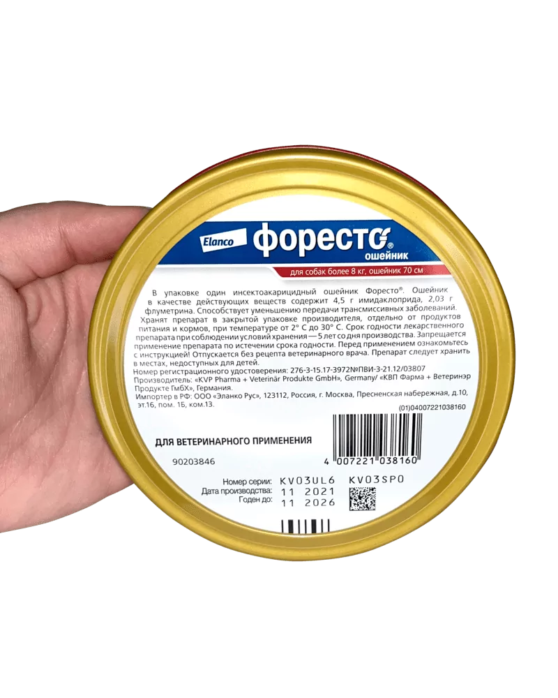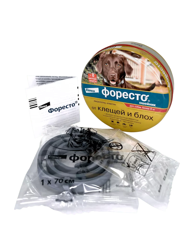 В ошейнике длиной 70 см — 4,5 г имидаклоприда и 2,03 г флуметрина. Форесто® – препарат наружного действия.