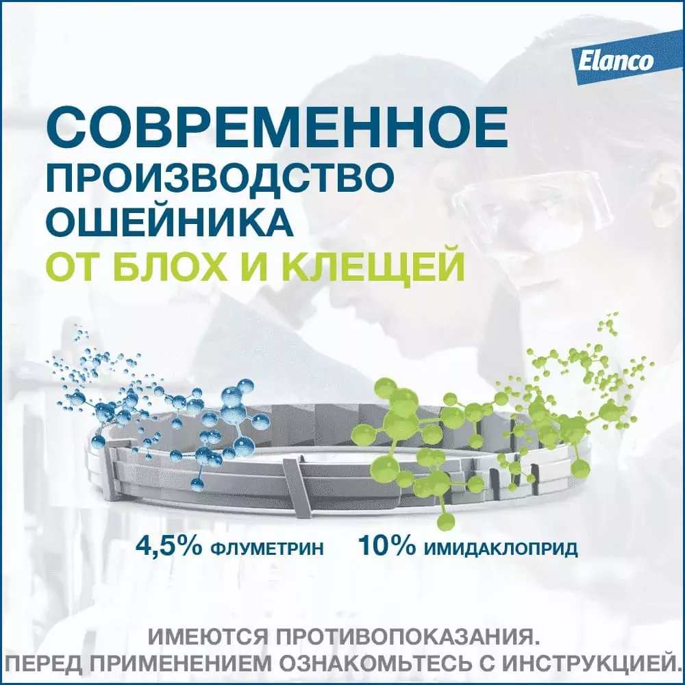 Материалы, из которых изготовлен ошейник, постоянно выделяют действующие вещества в небольших дозах, необходимых для защиты питомца. Действующие вещества распространяются по всей площади тела животного, помогая защитить его от наружных паразитов до 8 месяцев.